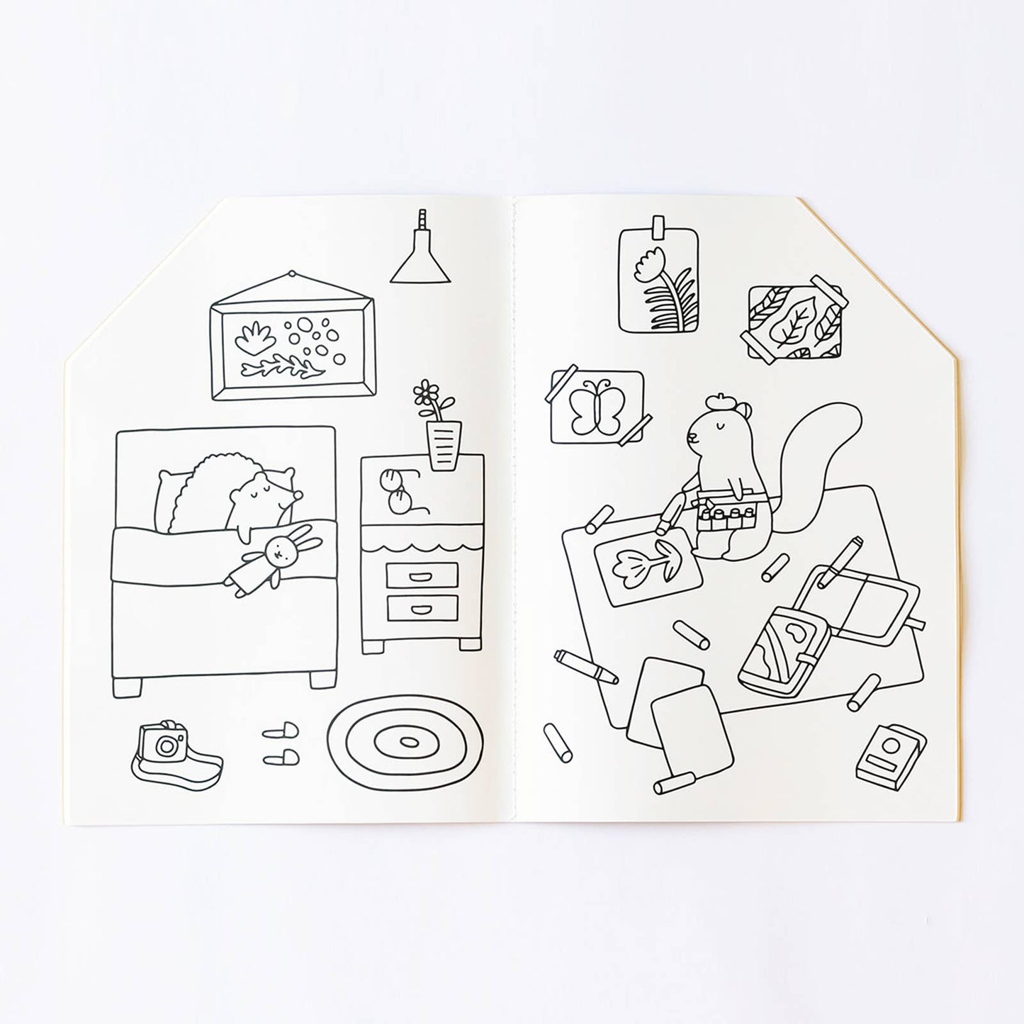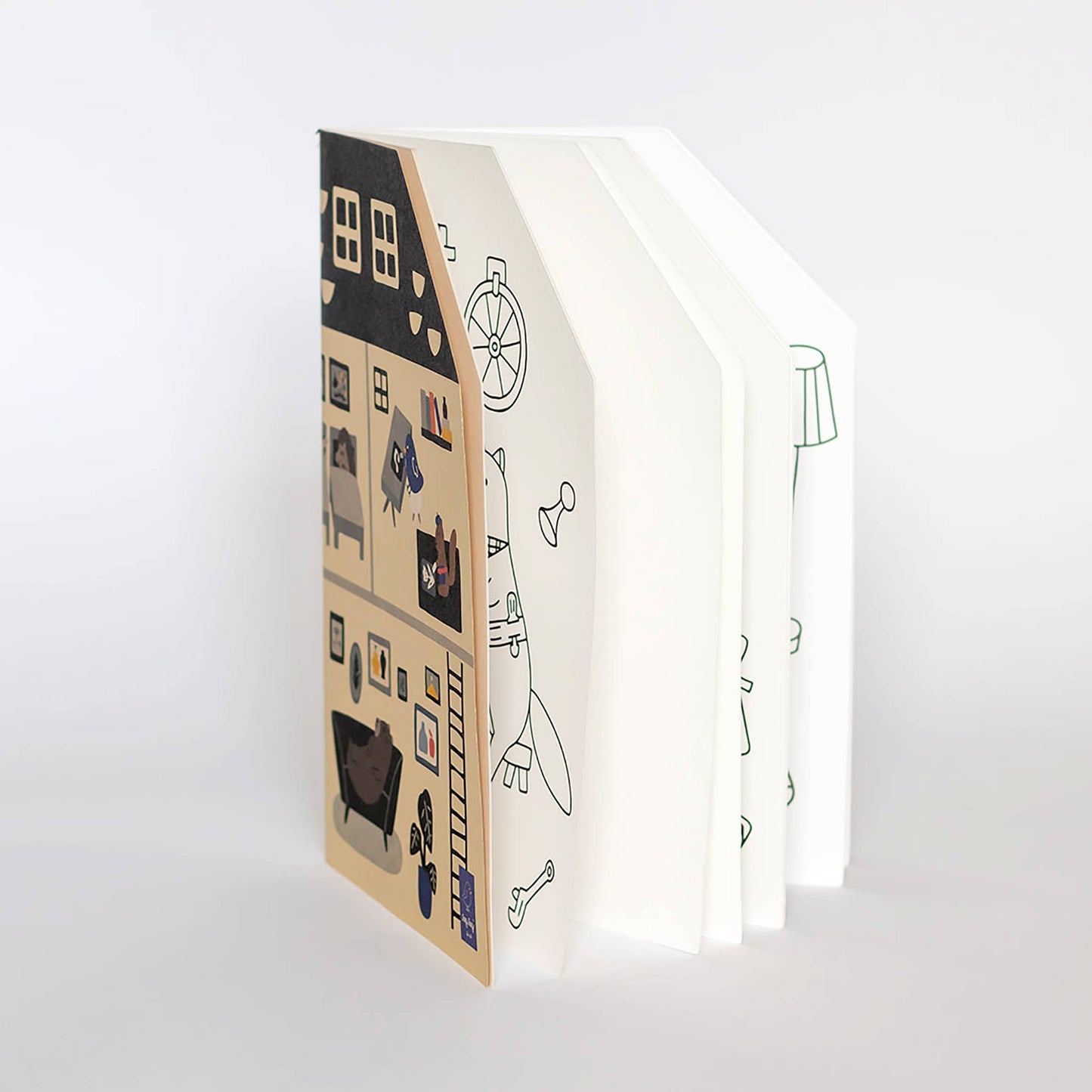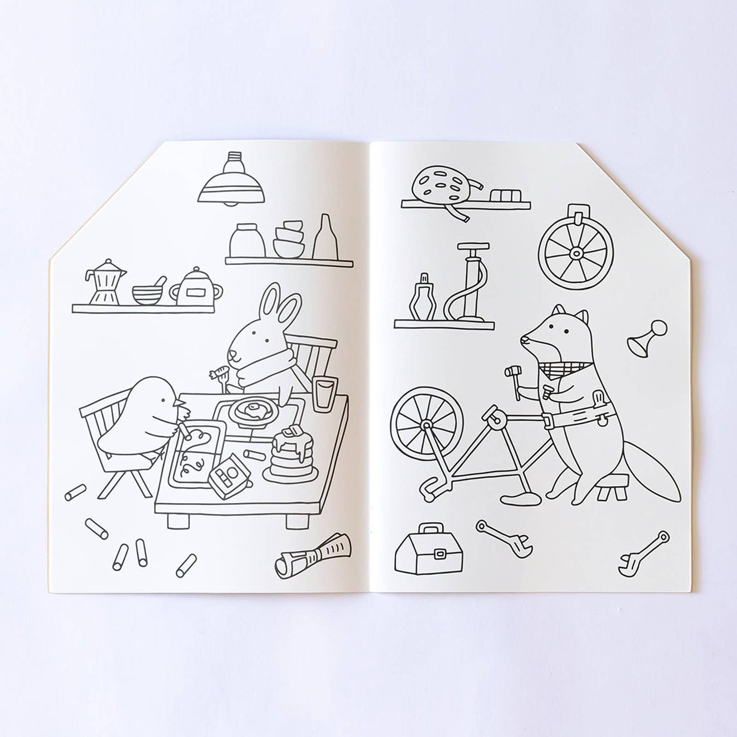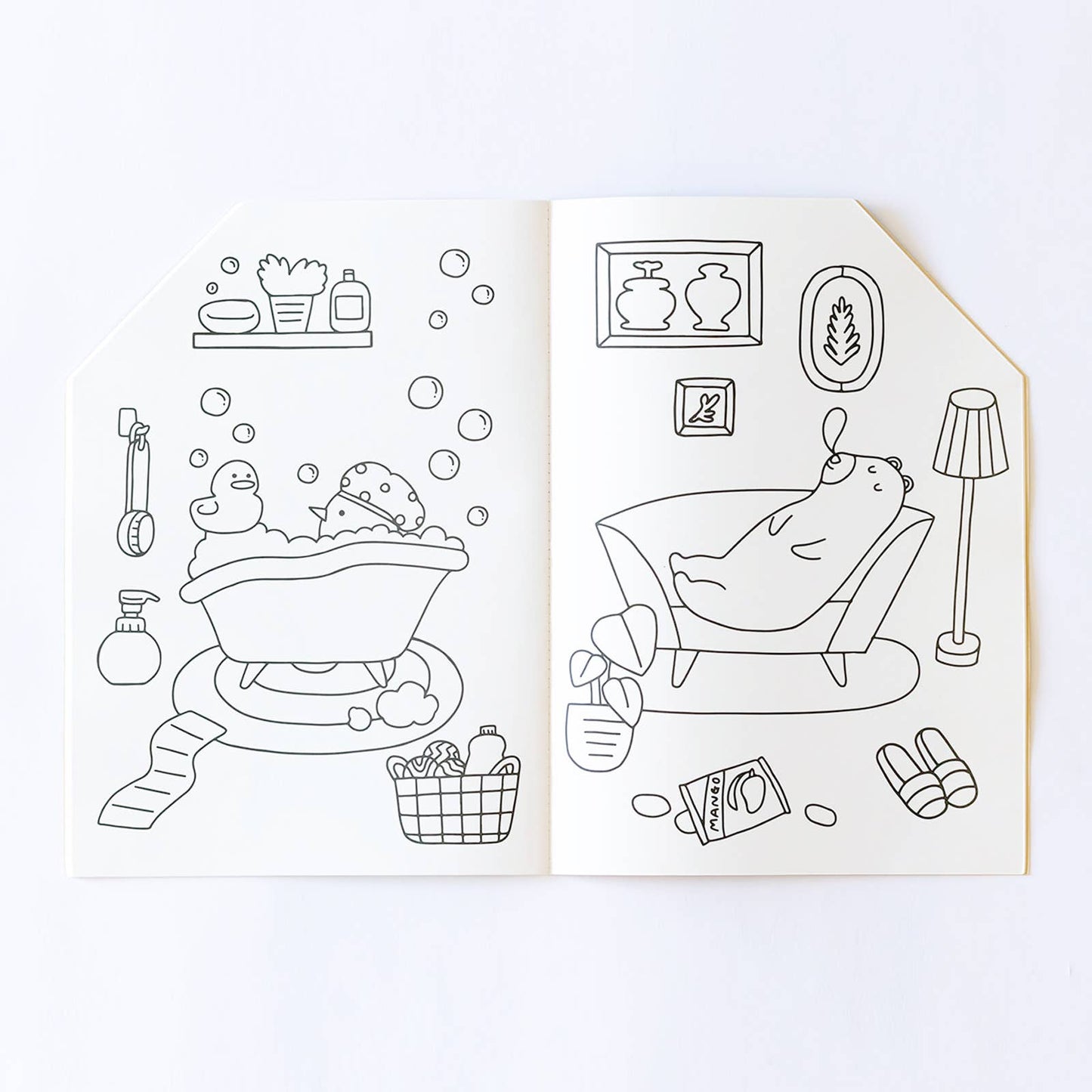 A jumbo sized coloring book featuring Jaq Jaq Bird characters and their friends in a delightful house setting. Meet Mango, Brunelli, Esme and Sloane in their favorite rooms as they cook, read, nap and take a bubble bath. Each book contains 6 fully illustrated pages for coloring and 26 blank pages for doodling, drawing or wherever imagination takes you.