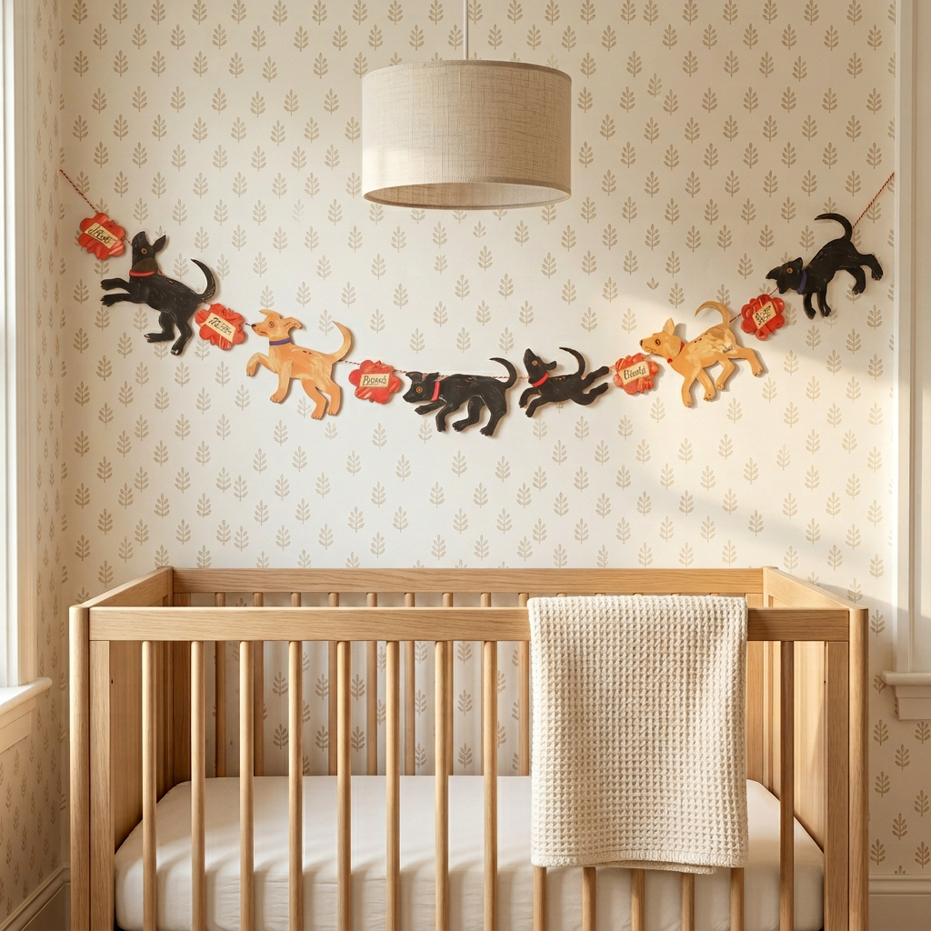 Each puppy is uniquely crafted with layered paper elements, capturing playful canine personalities through expressive shapes and thoughtful details. The garland arrives flat-packed in a paper wallet with colored twine included for easy assembly and display. Perfect for nurseries, children's rooms, or dog lovers' spaces, this artful decoration adds a touch of handcrafted charm to any setting.