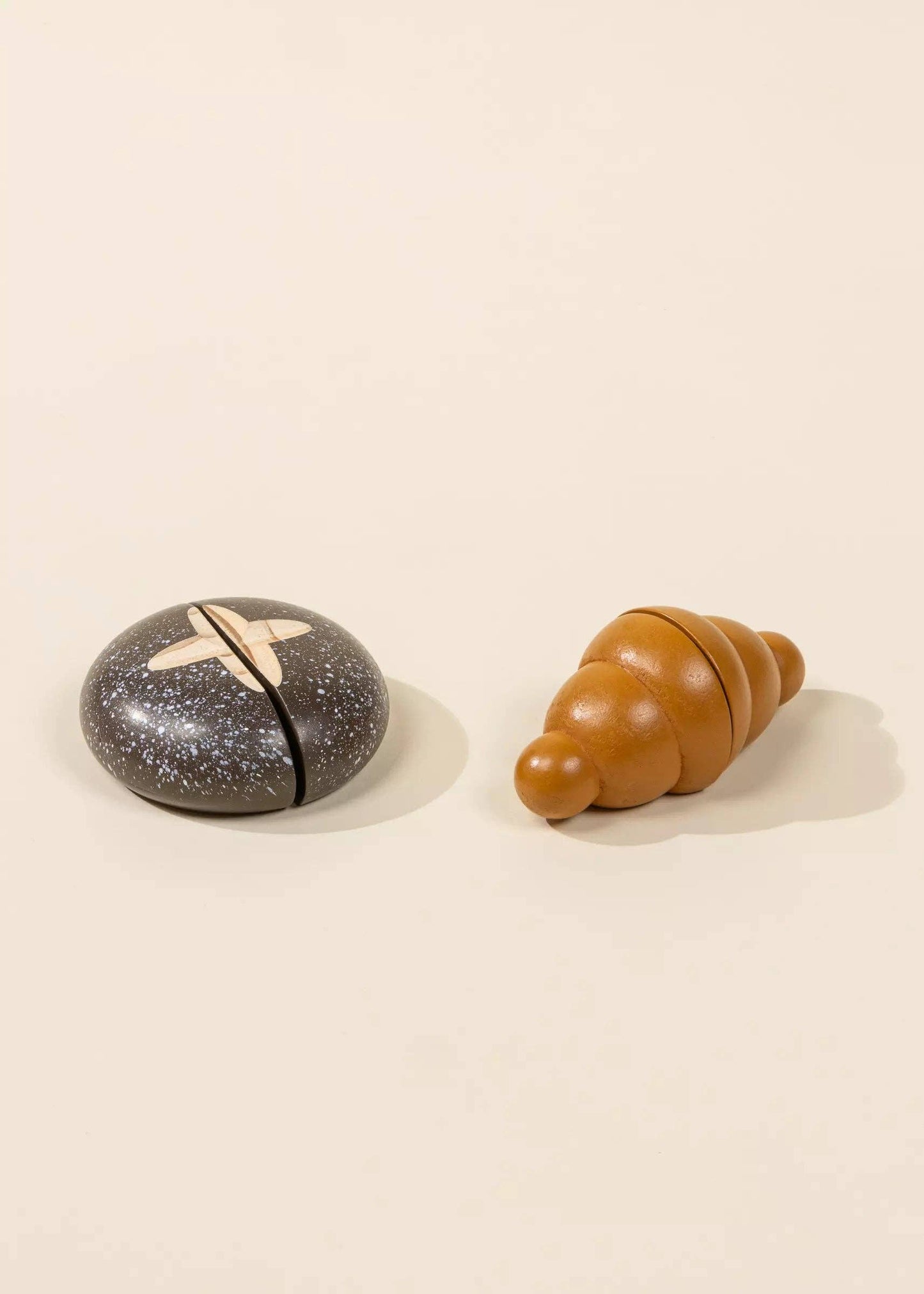Spark imaginative play with this wooden bakery set featuring a baguette, croissant, bagel, pumpernickel, cutting board, and knife. Durable construction invites hours of creative pretend play while introducing children to bakery favorites.