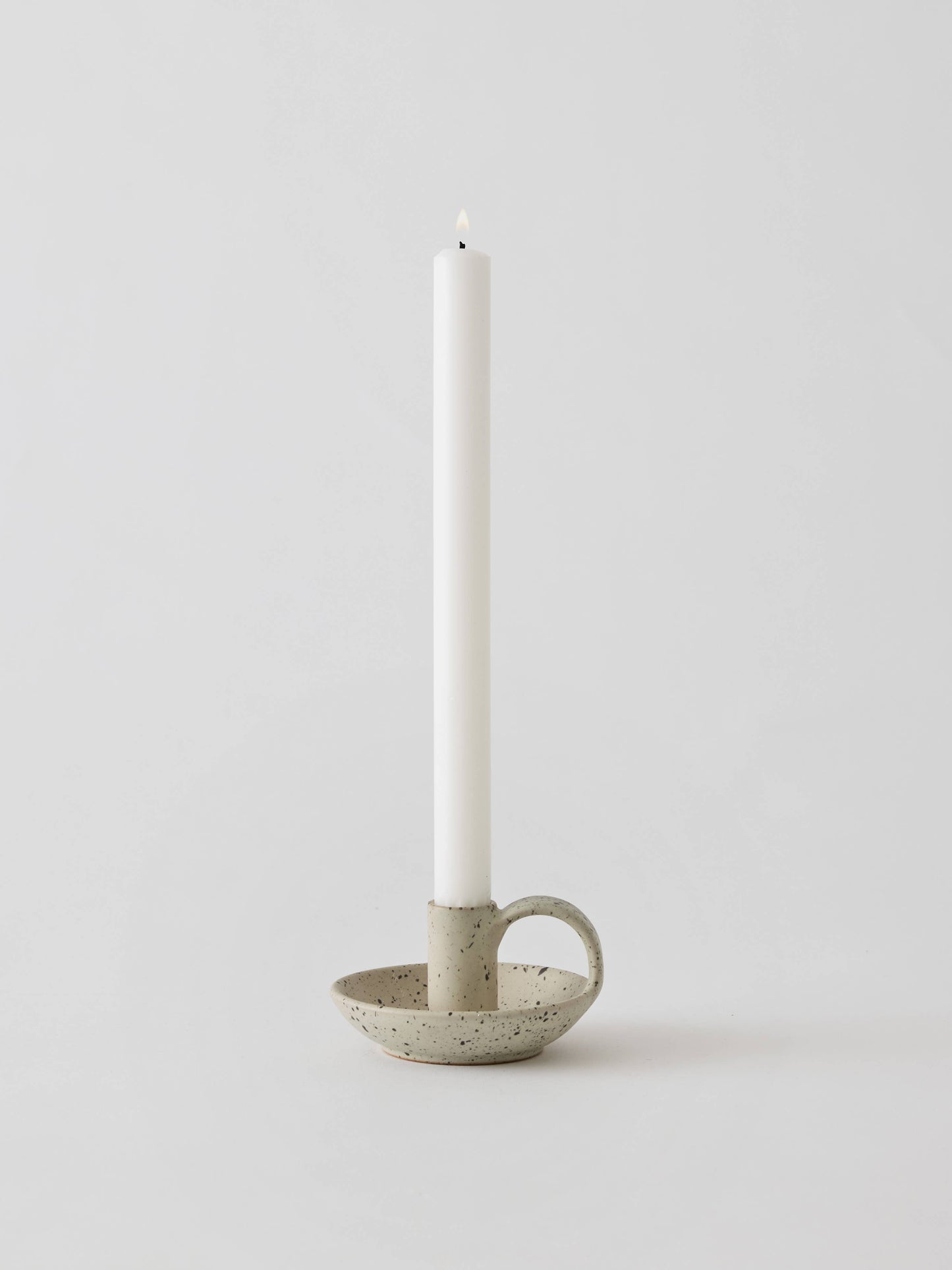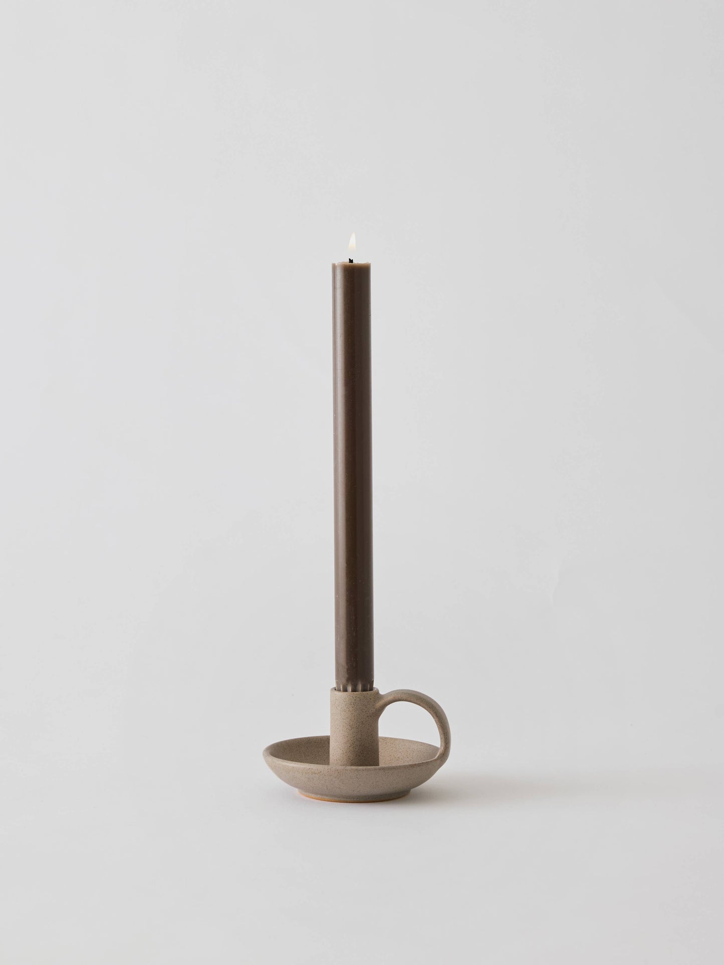Elegant candle holder crafted in glazed stoneware with a sophisticated matte finish. The Nimo features a practical handle on the side for easy handling and is perfectly sized for dinner candles. Each piece is handmade by local artisans in Nepal, making every candle holder unique with slight color variations that reflect the artisanal process.