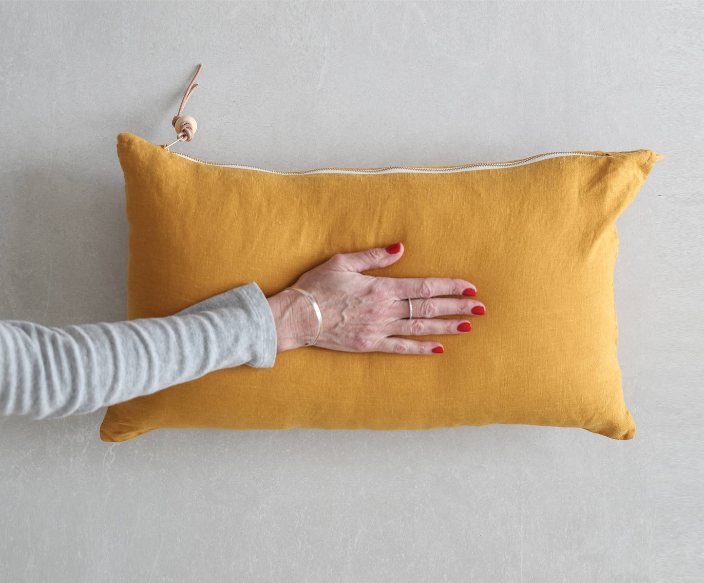 Showcase your style with this 100% linen pillow featuring a bold brass zipper and genuine leather pull for distinctive character. The prewashed cover ensures comfort and softness straight from the package. The ultra-soft synthetic down insert provides the traditional plump appearance associated with natural down.