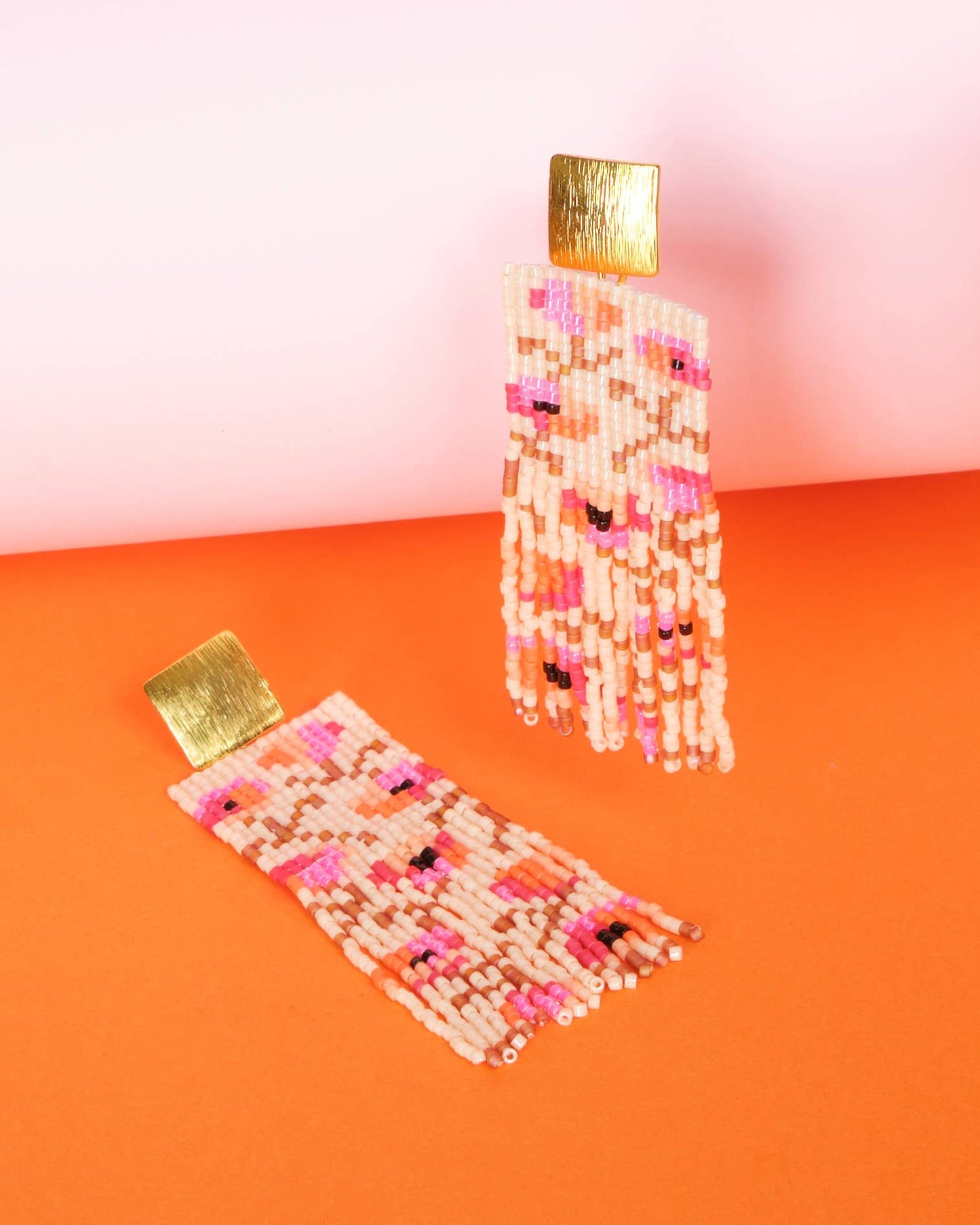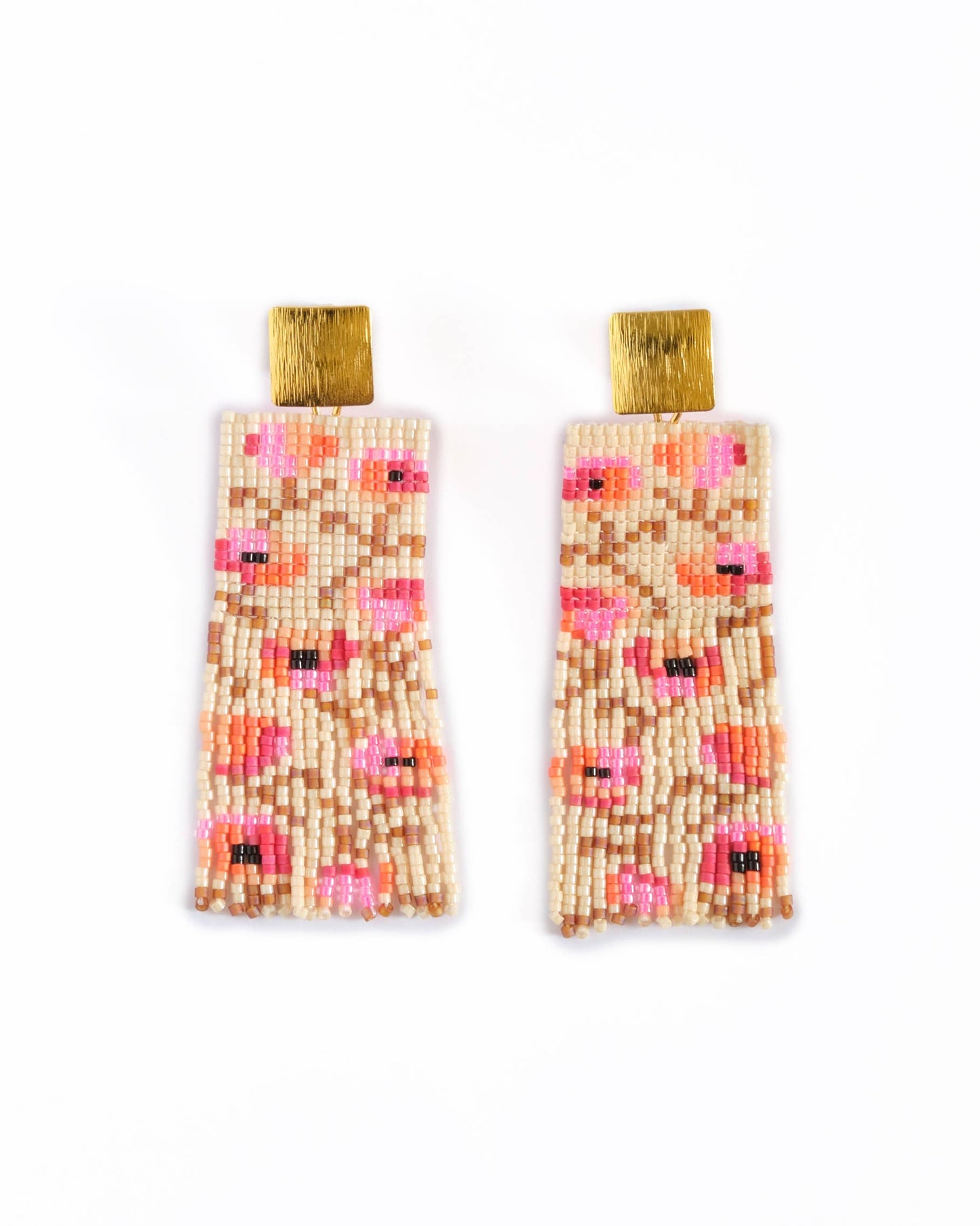 Beaded handwoven poppy flower fringe earrings (cream/pink)