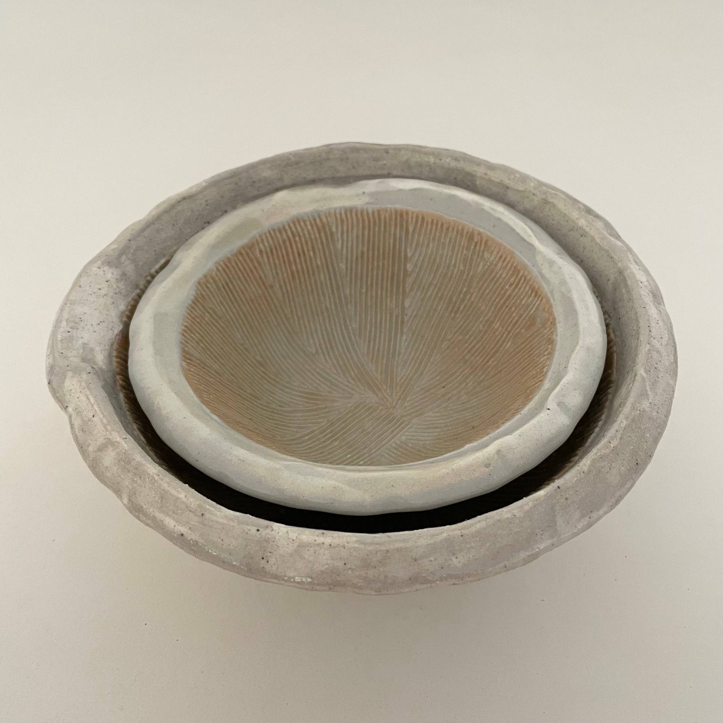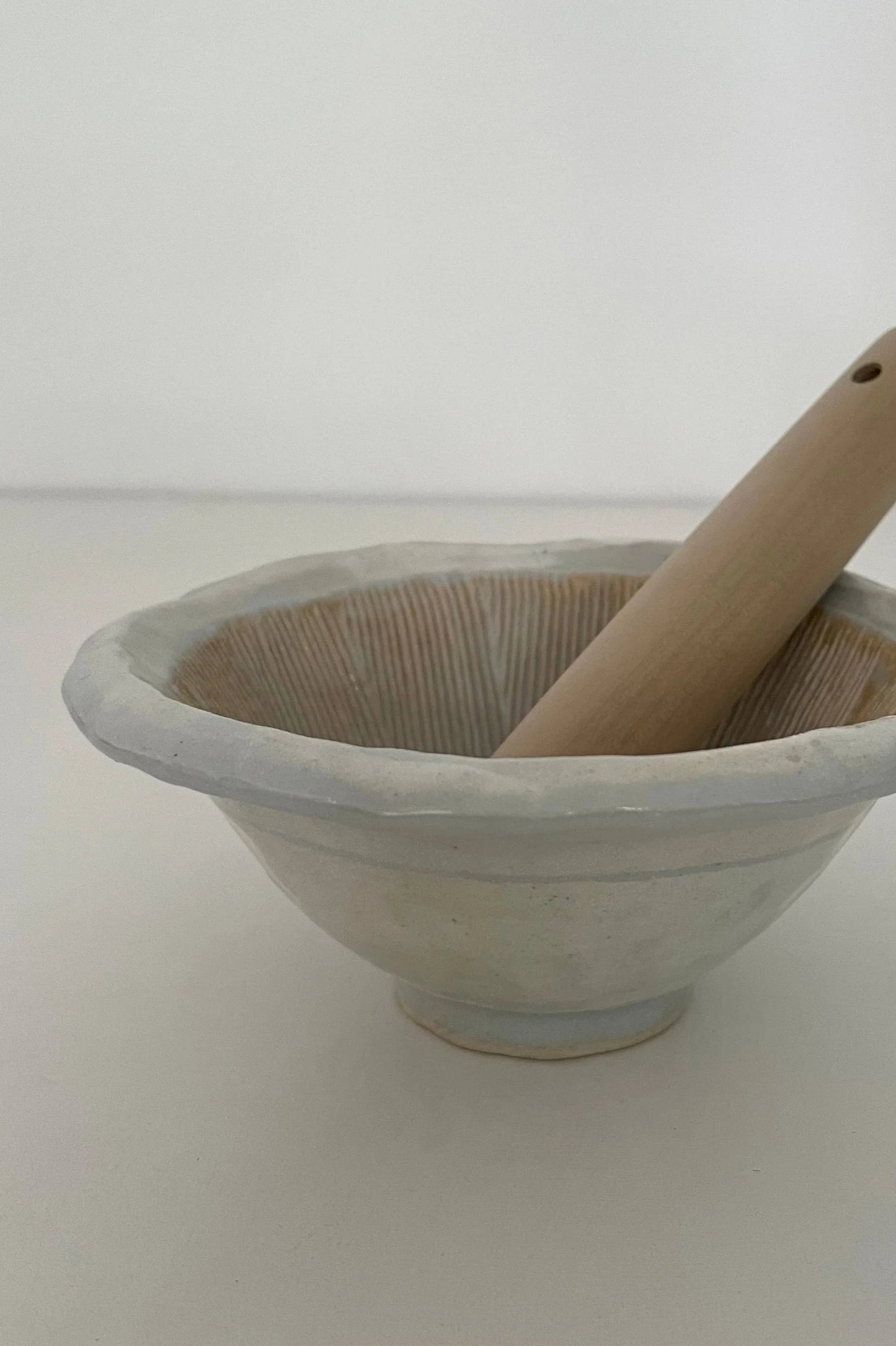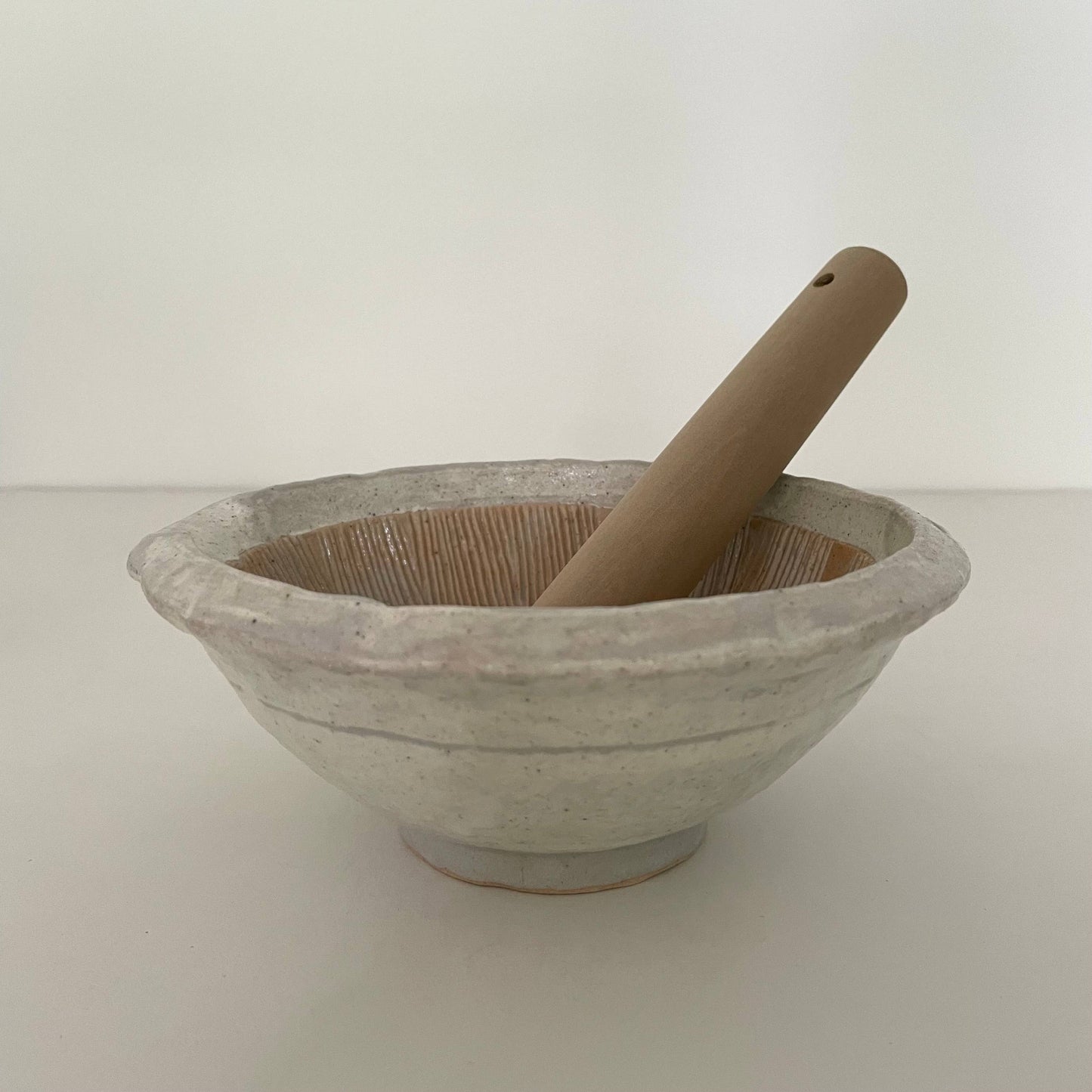 These Japanese mortars from fort & field feature an earthy, organic aesthetic created using the kohiki technique, where white slip is layered on dark clay before firing. This process creates a layered glaze with white, grey, and pinkish gohonte hues. Does not include a pestle - pair with hinoki cypress wood pestles or twig pestles (18cm / 7-inch pestle recommended).