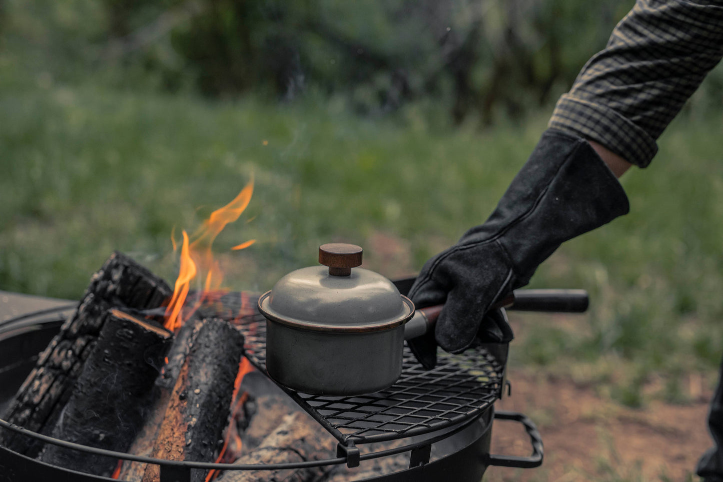 Simmer sauces, soups, and more with perfect heat distribution in this enamel saucepan. Its long walnut handle and tall sides keep you safe from splashes, whether you're cooking at home or camping. Featuring a hand-finished stainless steel trim with a warm, copper-like glow, this stylish pan offers charm for any meal.